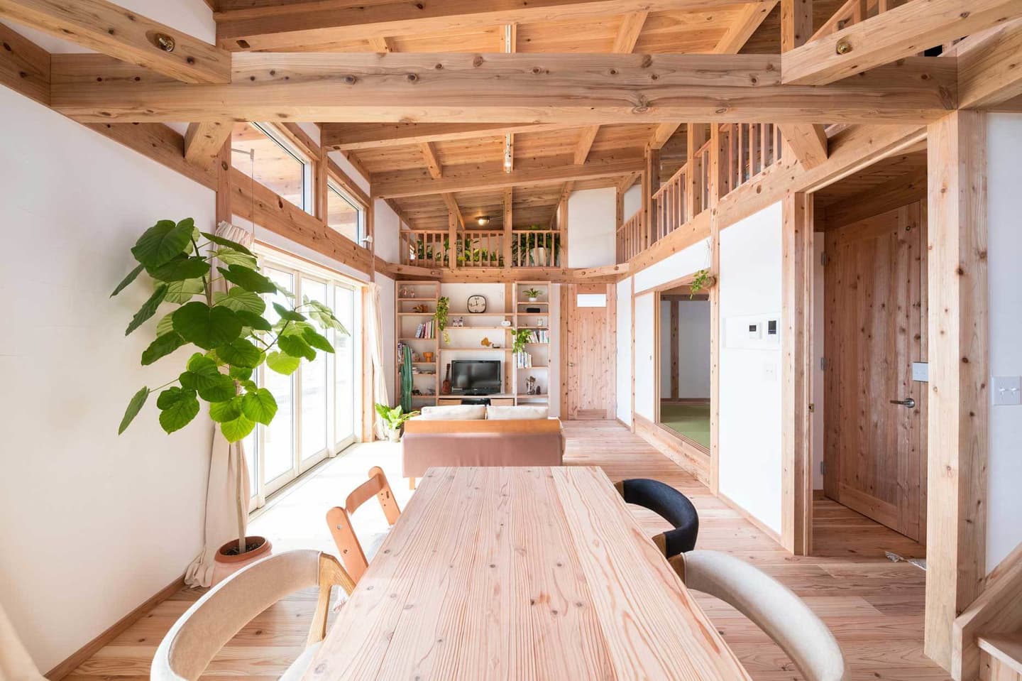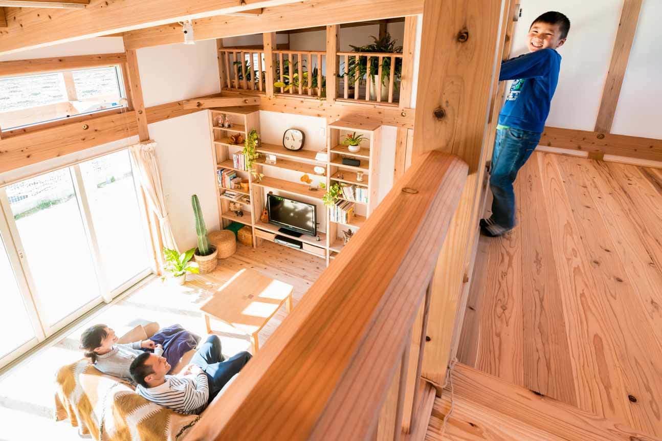 「家族が集まってくつろぐリビングは、できるだけ広くしたい」という夫婦の希望で、寝室として使う和室は小さく、キッチンは壁付け型でコンパクトにして、ダイニングを広々使えるようにしました。「2階がほしい」という息子さんのリクエストには、子ども部屋や趣味部屋として使えるフリースペース、収納部屋などがそろう、中2階を設けました。