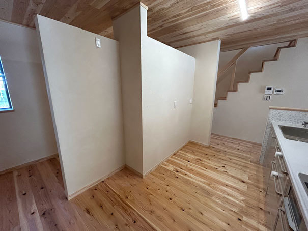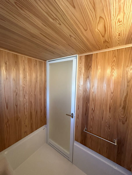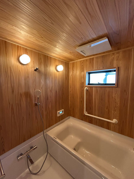 娘さんの“夢だった”という薪ストーブと、木の壁に包まれたハーフバスも実現。