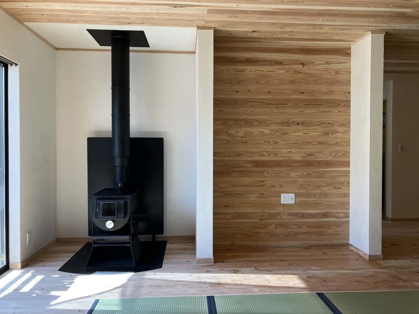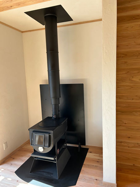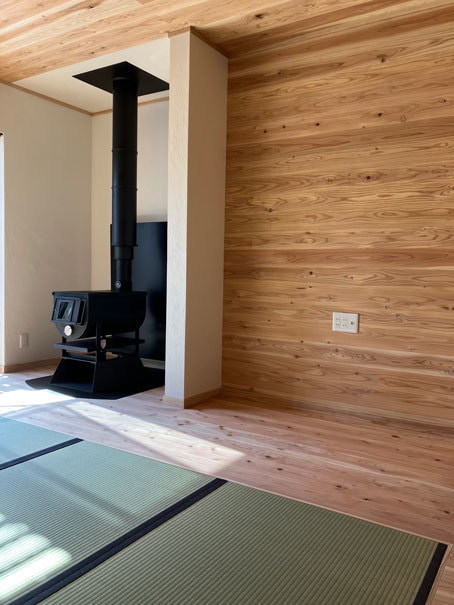 リビングの中心に据えられた薪ストーブは、家族のあたたかな時間を育む象徴となりました。