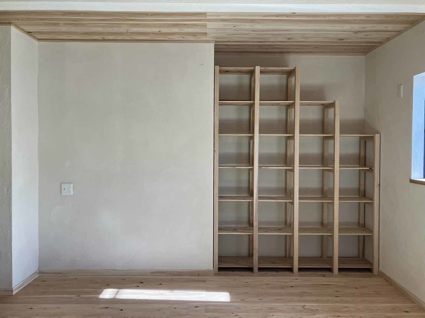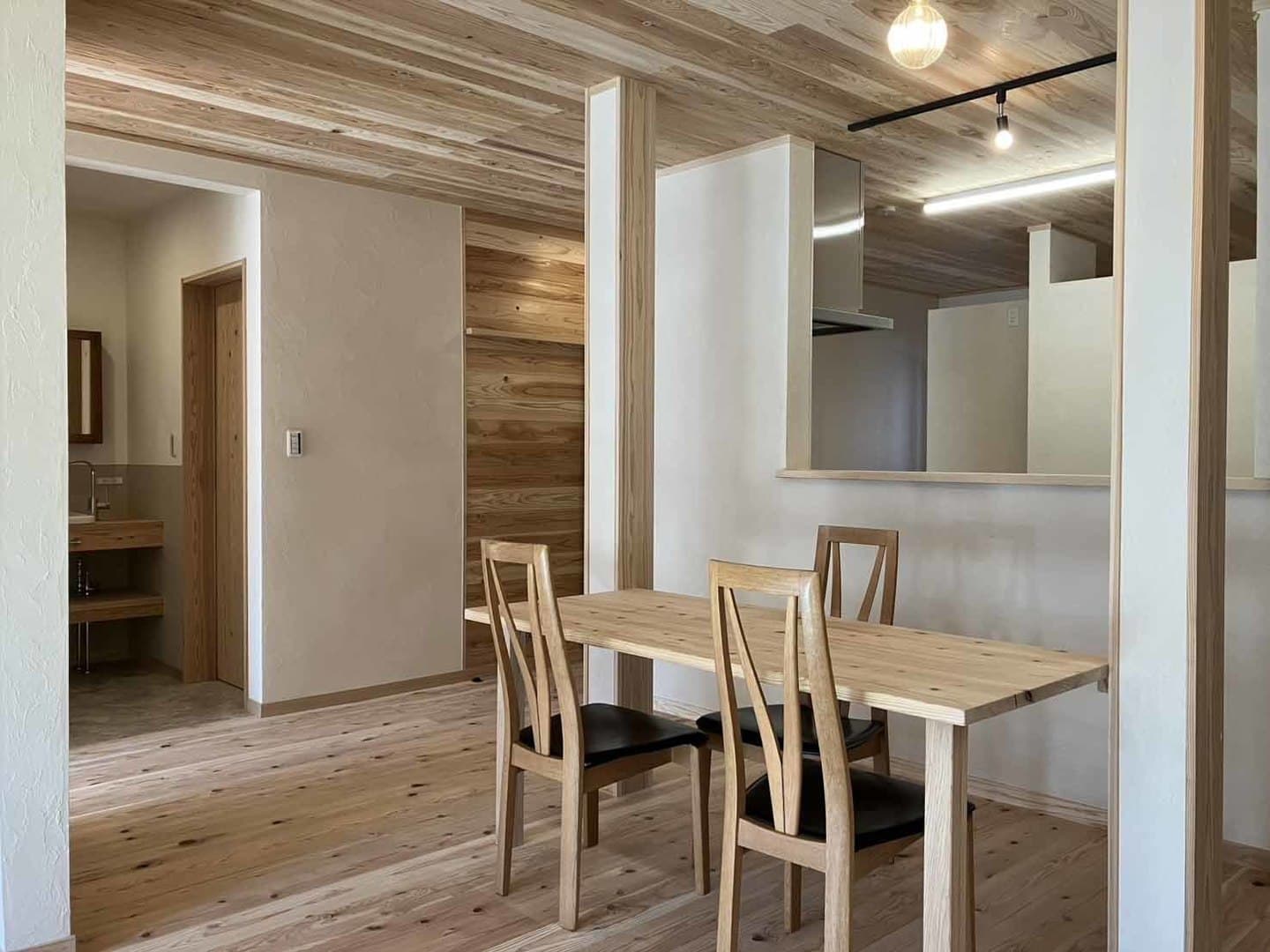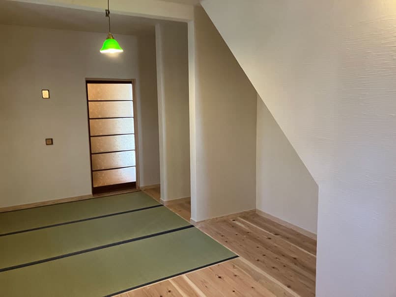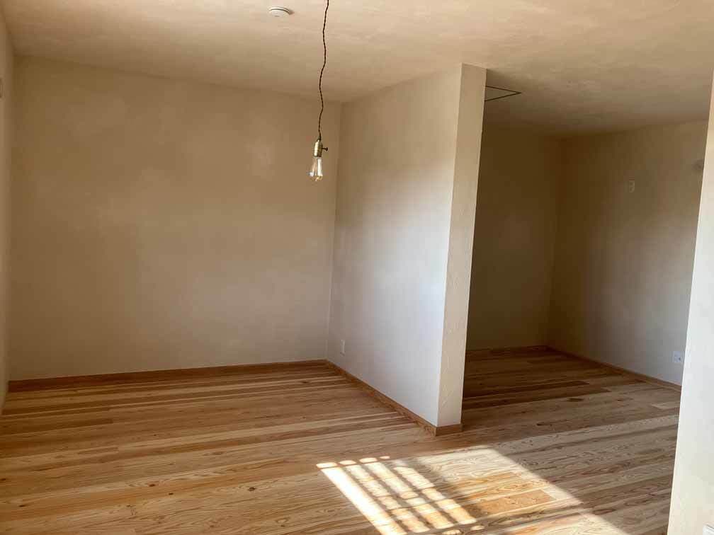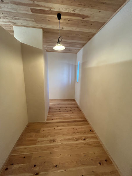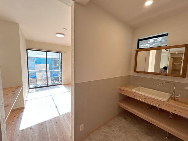 木のあたたかさと漆喰のやさしさに包まれた空間は、床・壁・天井のすべてに自然素材を使い、心地よい空気が流れています。50年前の建具を再利用した寝室と脱衣室の扉も、時を重ねた風合いが空間に趣を添えています。